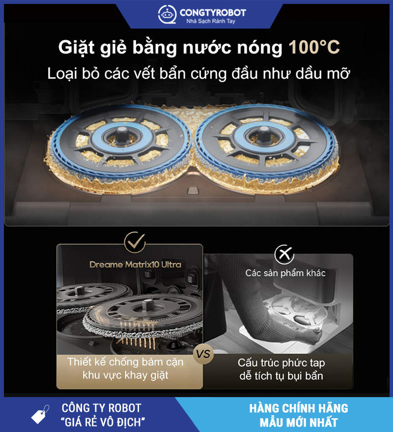 Trong khi nhiều robot trên thị trường chỉ giặt giẻ bằng nước thường hoặc tối đa 60–70°C, Dreame Matrix 10 Ultra đi trước một bước với công nghệ ThermoHub™ – giặt giẻ bằng nước nóng đến 100°C.