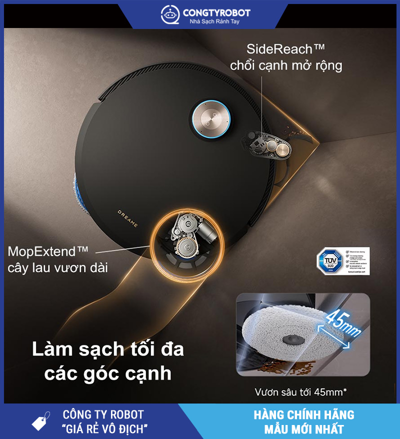 Một trong những điểm yếu phổ biến của robot hút bụi là không thể lau sát tường hoặc chân bàn, dẫn đến bụi bẩn tích tụ lâu ngày. Với MopExtend™ và SideReach™, Dreame Matrix 10 Ultra khắc phục hoàn toàn hạn chế đó.