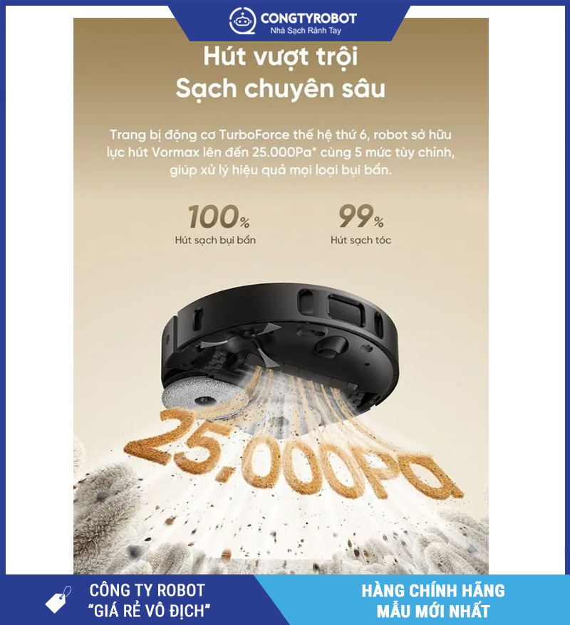Một trong những điểm nổi bật nhất của Robot hút bụi lau nhà Dreame D30 Ultra – Bản Quốc Tế là lực hút Vormax mạnh mẽ lên tới 25.000Pa. Đây là mức lực hút cao, cho phép robot xử lý hiệu quả nhiều loại bụi bẩn khác nhau như bụi mịn, tóc rụng, lông thú cưng, vụn thức ăn và các mảnh rác nhỏ trên sàn.