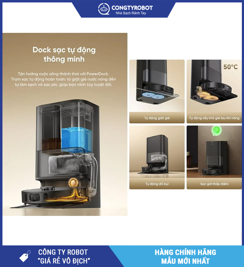 Một trong những giá trị lớn của Robot hút bụi lau nhà Dreame D30 Ultra chính là trạm sạc đa năng PowerDock. Đây không chỉ là nơi robot quay về sạc pin mà còn đóng vai trò là trung tâm hỗ trợ quá trình vệ sinh tự động, giúp giảm bớt đáng kể thao tác thủ công cho người dùng.
