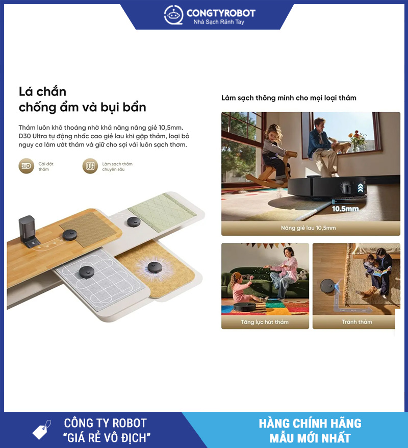 Với những gia đình sử dụng thảm trong phòng khách, phòng ngủ hoặc khu vực sinh hoạt chung, Dreame D30 Ultra là giải pháp phù hợp nhờ khả năng tối ưu hóa làm sạch cho không gian có thảm.