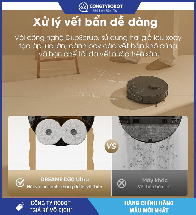 Dreame D30 Ultra – Bản Quốc Tế sở hữu công nghệ lau xoay kép DuoScrub, giúp gia tăng hiệu quả lau chà trên sàn nhà. Cơ chế lau xoay kép tạo ma sát mạnh hơn so với kiểu lau kéo truyền thống, từ đó hỗ trợ xử lý tốt hơn các vết bẩn bám dính, dấu chân hoặc bụi bẩn khô bám trên bề mặt.