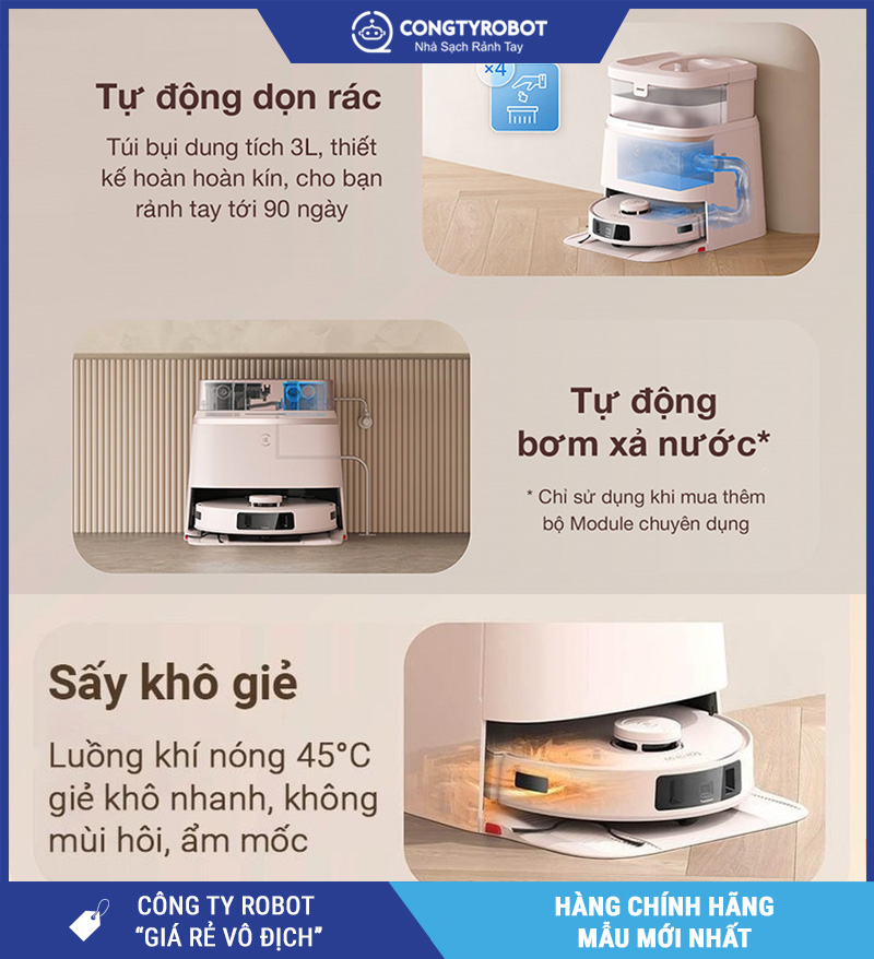 | Tự động đổ rác | Có – hút bụi vào túi 3L |