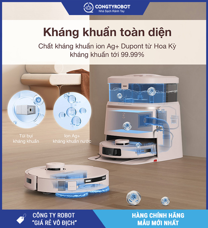 Robot được trang bị hệ thống giặt khăn lau bằng nước nóng 70°C, giúp loại bỏ vi khuẩn và vết bẩn cứng đầu. Sau khi lau, khăn được sấy khô ở nhiệt độ 45°C, ngăn ngừa mùi hôi và sự phát triển của vi khuẩn.