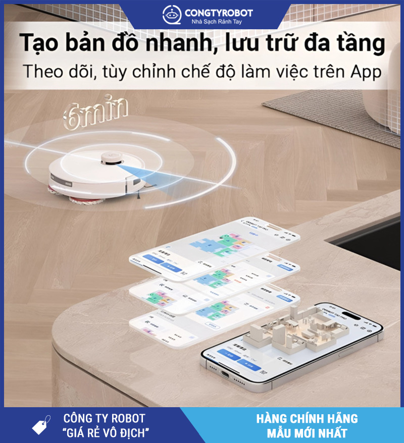 Robot sử dụng công nghệ lập bản đồ tiên tiến, tạo sơ đồ nhà nhanh chóng và chính xác, tối ưu hóa lộ trình làm sạch và tiết kiệm thời gian.