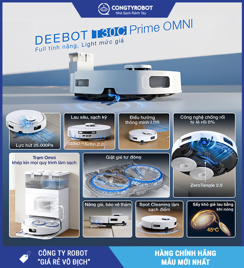 Ecovacs Deebot T30C Prime Omni là mẫu robot hút bụi lau nhà được định hướng cho nhu cầu làm sạch toàn diện trong gia đình hiện đại. Điểm nổi bật của sản phẩm nằm ở sự kết hợp giữa lực hút tối đa 25.000Pa, hệ thống lau xoay OZMO Turbo 2.0, cụm chổi chống rối chuyên biệt, khả năng tự động nâng giẻ 9mm khi gặp thảm, cùng trạm OMNI hỗ trợ hút rác, giặt giẻ, sấy khô và cấp nước gần như tự động. Trang sản phẩm cũng cho biết robot sử dụng pin 5.200mAh, thời gian hoạt động tối đa 220 phút, độ ồn cao nhất 63.8dB, bình nước sạch và nước thải 4L/4L, cùng túi chứa bụi 3L.