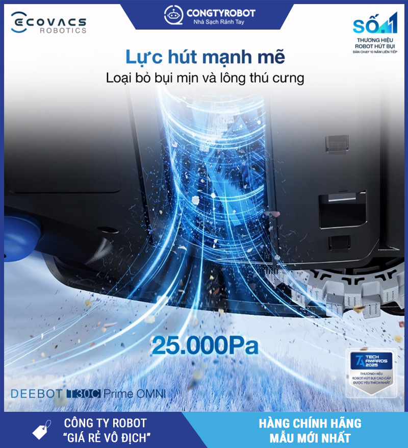 Một trong những điểm nổi bật nhất của Ecovacs Deebot T30C Prime Omni là lực hút tối đa 25.000Pa. Theo mô tả trên trang sản phẩm, mức lực hút này giúp robot dễ dàng xử lý bụi mịn, vụn thức ăn, tóc và các loại rác nhỏ bám sâu trong khe sàn hoặc sợi thảm. Đây là lợi thế rất đáng giá vì trong thực tế, bụi bẩn trong nhà không chỉ nằm trên bề mặt mà thường bám vào các rãnh nhỏ, góc khuất hoặc len sâu vào chất liệu thảm.