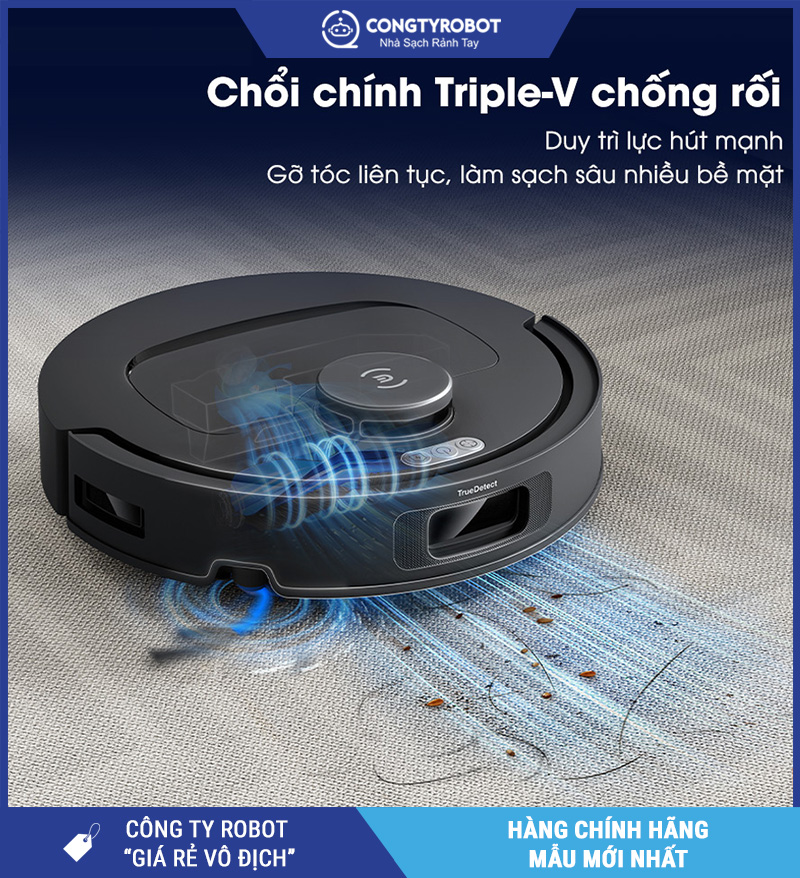 Bên cạnh chổi cạnh, chổi chính Triple-V cũng là một thành phần quan trọng trong cơ chế làm sạch của Ecovacs Deebot T30C Prime Omni. Trang sản phẩm mô tả cấu trúc này gồm lông chổi chữ V nâng bụi, chổi xoắn gom rác và lược chữ V tách tóc, giúp toàn bộ quá trình gom bụi, đưa rác vào họng hút và giảm tóc bám vào trục lăn diễn ra đồng bộ hơn.