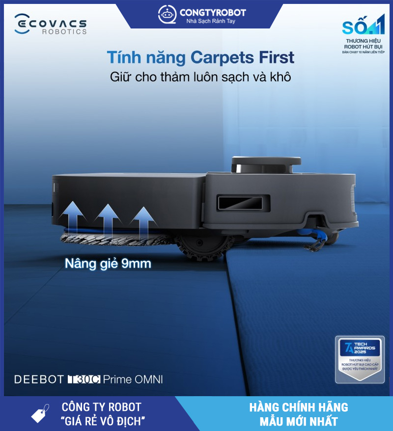 Ecovacs Deebot T30C Prime Omni có khả năng tự động nâng giẻ lau 9mm khi gặp thảm. Theo trang sản phẩm, khi phát hiện khu vực thảm, robot sẽ kích hoạt chế độ Carpets First, ưu tiên hút sạch trước để tránh làm ướt bề mặt. Đồng thời, giẻ lau được nâng lên để robot di chuyển an toàn hơn mà không làm bẩn hoặc ảnh hưởng đến chất liệu thảm.