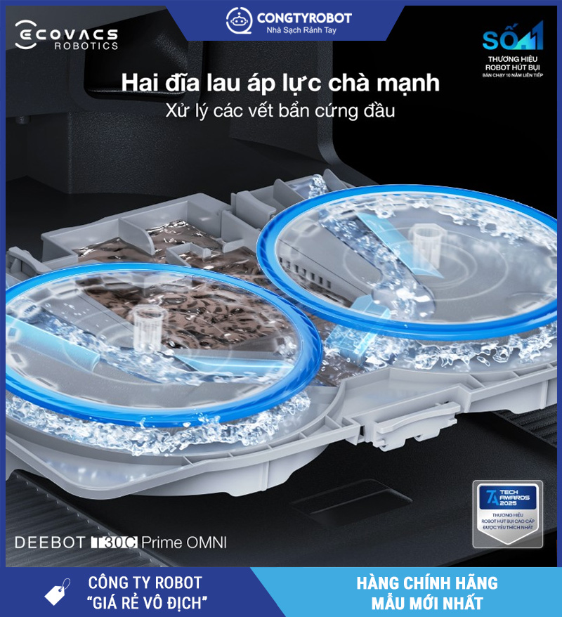 Khả năng lau sàn của Ecovacs Deebot T30C Prime Omni được nâng cấp với OZMO Turbo 2.0. Theo mô tả từ trang sản phẩm, hệ thống này sử dụng hai đĩa lau xoay áp lực cao để hỗ trợ chà sạch các vết bẩn bám lâu như cà phê, dấu chân hoặc vết nước khô trên sàn. So với kiểu lau kéo truyền thống, lau xoay thường cho hiệu quả chà rửa rõ hơn ở các vết bám cần tác động mạnh hơn trên bề mặt.