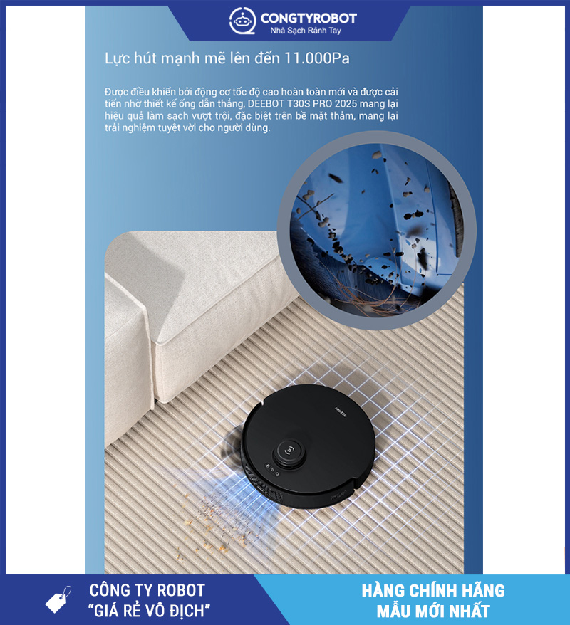 So với nhiều dòng robot hút bụi phổ thông chỉ đạt 3.000–5.000Pa, T30S Pro gây ấn tượng với lực hút 11.000Pa, giúp dọn sạch cả lông thú, bụi mịn và mảnh vụn lớn trên thảm và sàn cứng.