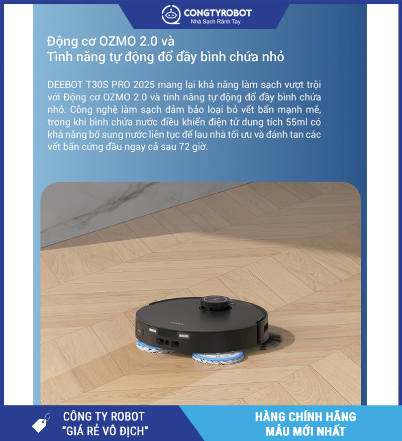 Ecovacs Deebot T30S Pro là một trong những mẫu robot hút bụi lau nhà đáng chú ý năm 2025 trong phân khúc tầm trung. Mặc dù có mức giá dễ tiếp cận, T30S Pro vẫn được trang bị nhiều công nghệ tiên tiến như lực hút mạnh mẽ 11.000Pa, hệ thống lau xoay thông minh, tránh vật cản AIVI Lite, trạm sạc tự giặt giẻ – xả nước tự động và điều khiển bằng giọng nói tiếng Việt.