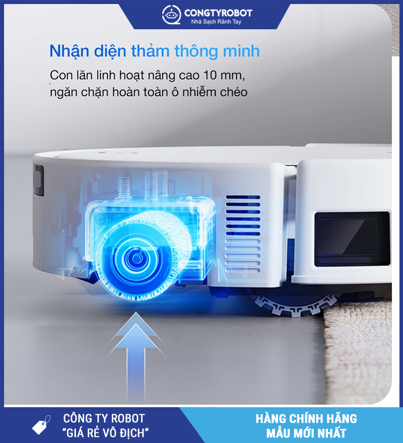Nhà có thảm thường lo robot vừa lau vừa chạy qua sẽ làm ẩm thảm hoặc kéo bẩn từ sàn ướt lên thảm. Với cơ chế nâng con lăn 10mm khi gặp thảm, T80S Omni hạn chế tiếp xúc của phần lau với bề mặt thảm, giảm ẩm và giảm ô nhiễm chéo.