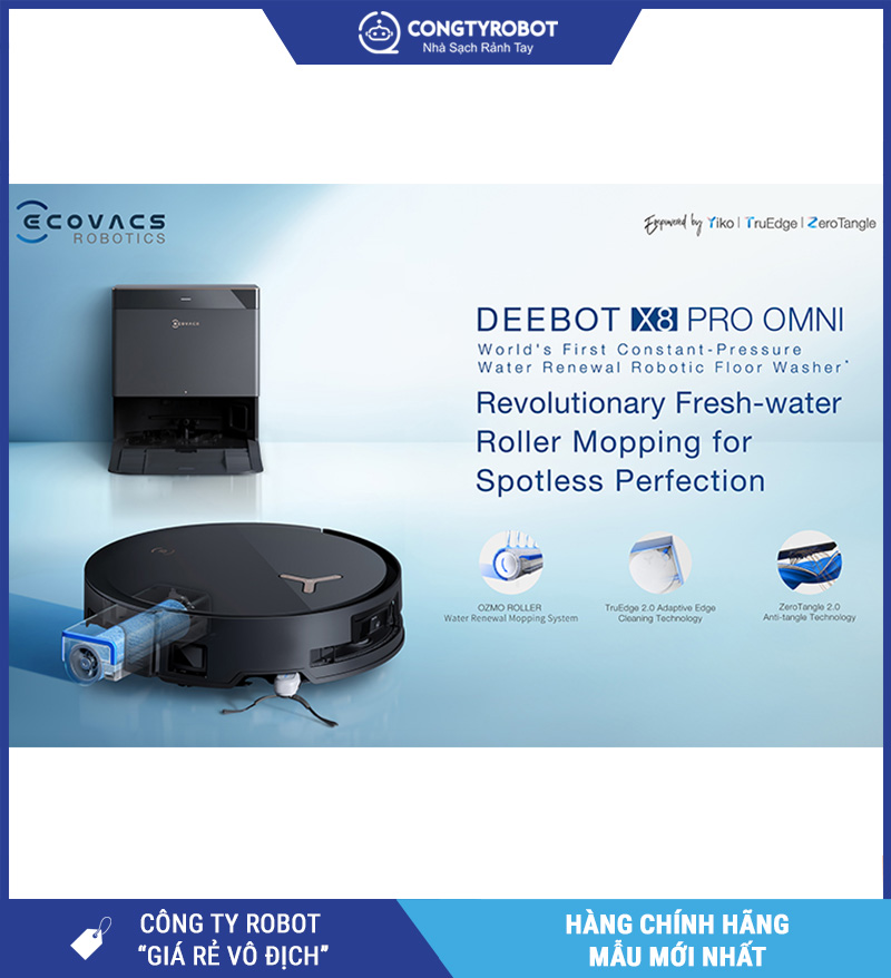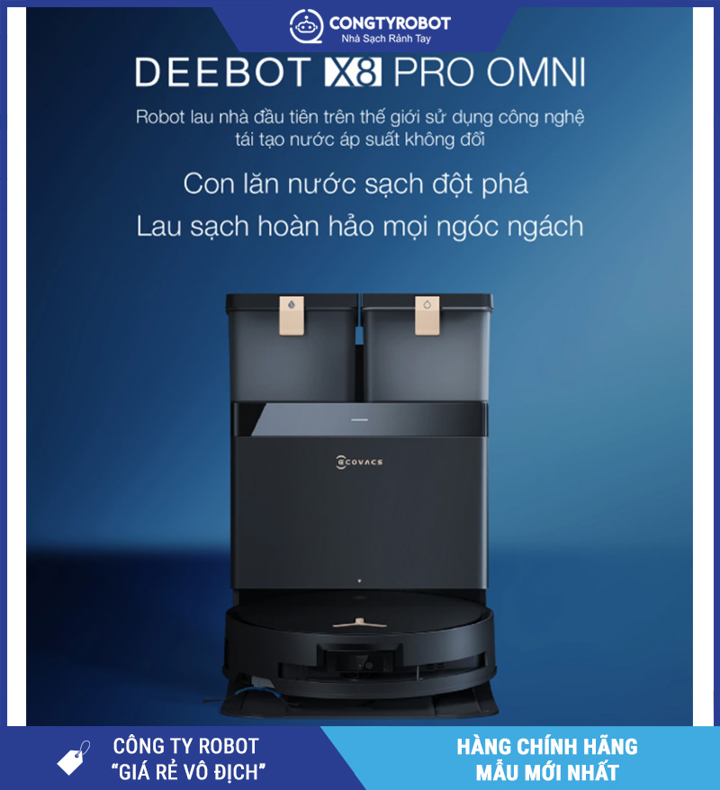 Trong thời đại công nghệ bùng nổ, việc dọn dẹp nhà cửa không còn là gánh nặng khi bạn có sự trợ giúp từ Ecovacs Deebot X8 Pro Omni 2025 – một trong những robot hút bụi lau nhà thông minh và toàn diện nhất hiện nay. Sản phẩm sở hữu những công nghệ mới nhất của Ecovacs, từ AI, lực hút cực mạnh đến khả năng tự chăm sóc “từ đầu đến chân” – giúp bạn nhẹ nhàng hóa mọi công việc vệ sinh nhà cửa.