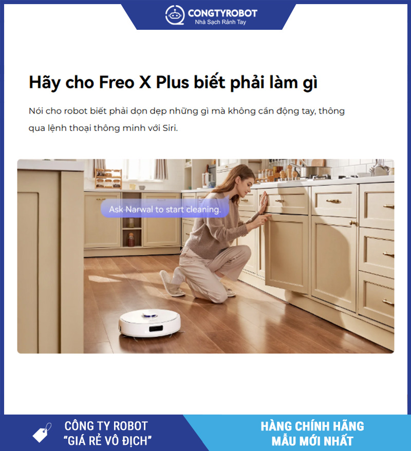 Narwal Freo X Plus hỗ trợ điều khiển bằng giọng nói, giúp người dùng có thể ra lệnh cho robot bắt đầu dọn dẹp mà không cần thao tác trực tiếp trên máy.