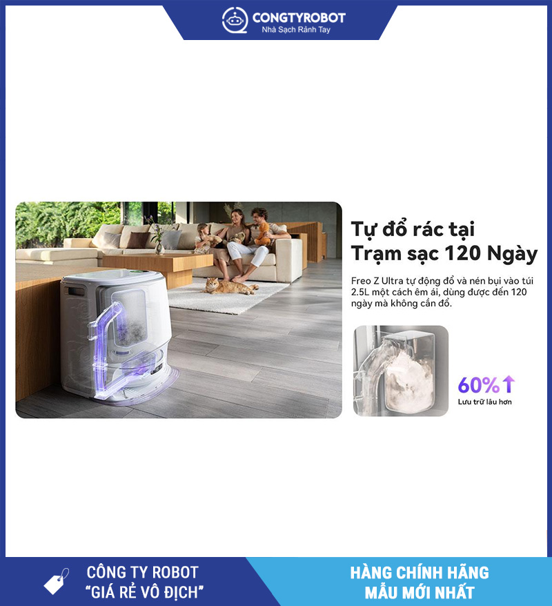 Narwal cho biết Freo Z Ultra hỗ trợ tự đổ rác tại trạm sạc lên đến 120 ngày, giúp giảm đáng kể tần suất người dùng phải can thiệp vào việc xử lý bụi. Đây là một lợi ích rất rõ với gia đình bận rộn, vì robot có thể duy trì chu trình dọn dẹp trong thời gian dài mà không cần đổ rác liên tục sau mỗi vài ngày.