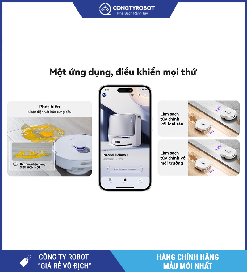 Narwal Freo Z Ultra được quản lý qua ứng dụng, nơi người dùng có thể lập bản đồ, chia phòng, lên lịch dọn dẹp, chọn khu vực cần làm sạch và điều chỉnh các chế độ vận hành phù hợp với từng không gian. Trên các trang sản phẩm, Narwal cũng nhấn mạnh khả năng tùy chỉnh sở thích làm sạch và kiểm soát robot toàn diện hơn qua app.
