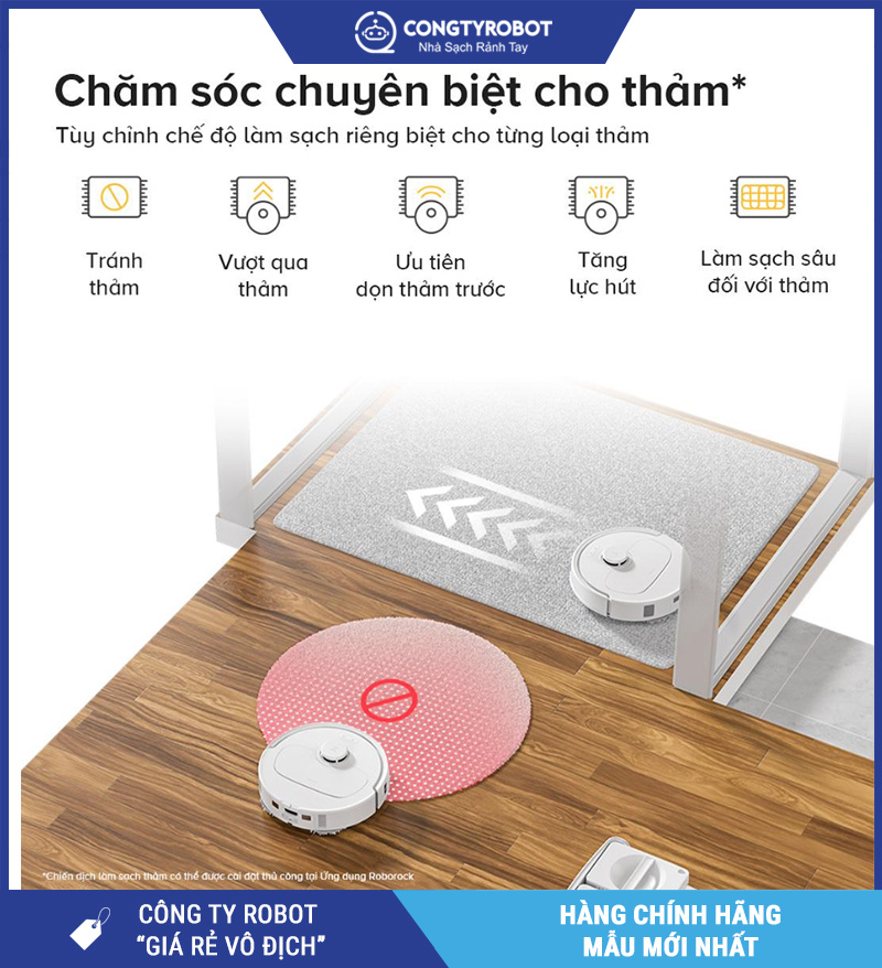 Tích hợp khả năng tự nâng giẻ khi phát hiện thảm, tránh làm ướt hoặc cản trở robot di chuyển.