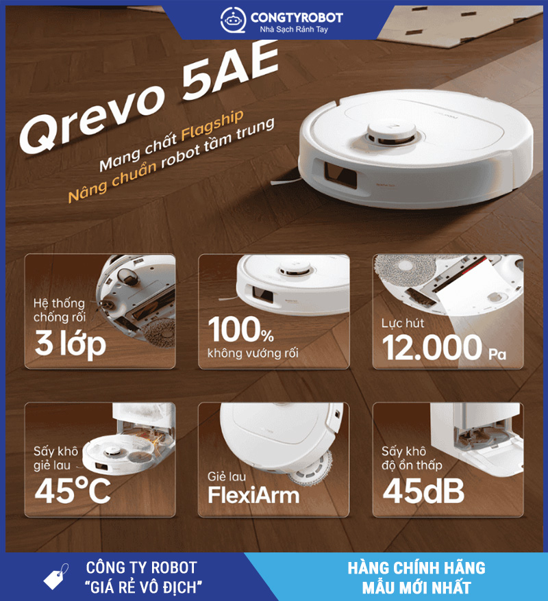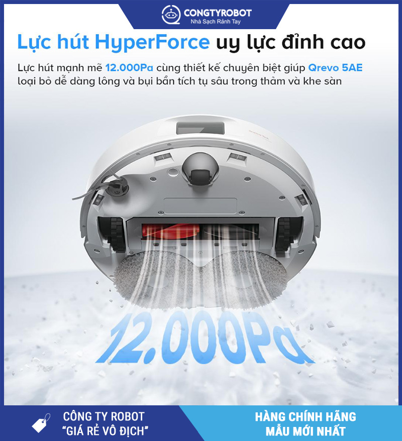 Roborock Q Revo 5AE là mẫu robot hút bụi lau nhà thế hệ mới đến từ thương hiệu Roborock, nổi bật với hàng loạt công nghệ đột phá như: lực hút HyperForce 12.000Pa, hệ thống chống rối 3 lớp, công nghệ Reactive Tech, giẻ lau xoay kép nâng hạ thông minh và trạm sạc đa năng tự động. Thiết bị không chỉ tối ưu hiệu suất làm sạch mà còn mang đến trải nghiệm rảnh tay tuyệt đối cho người dùng hiện đại.