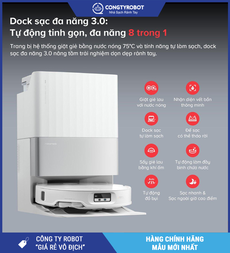 | Dock sạc | Giặt giẻ nước nóng, tự đổ rác, sấy khô |