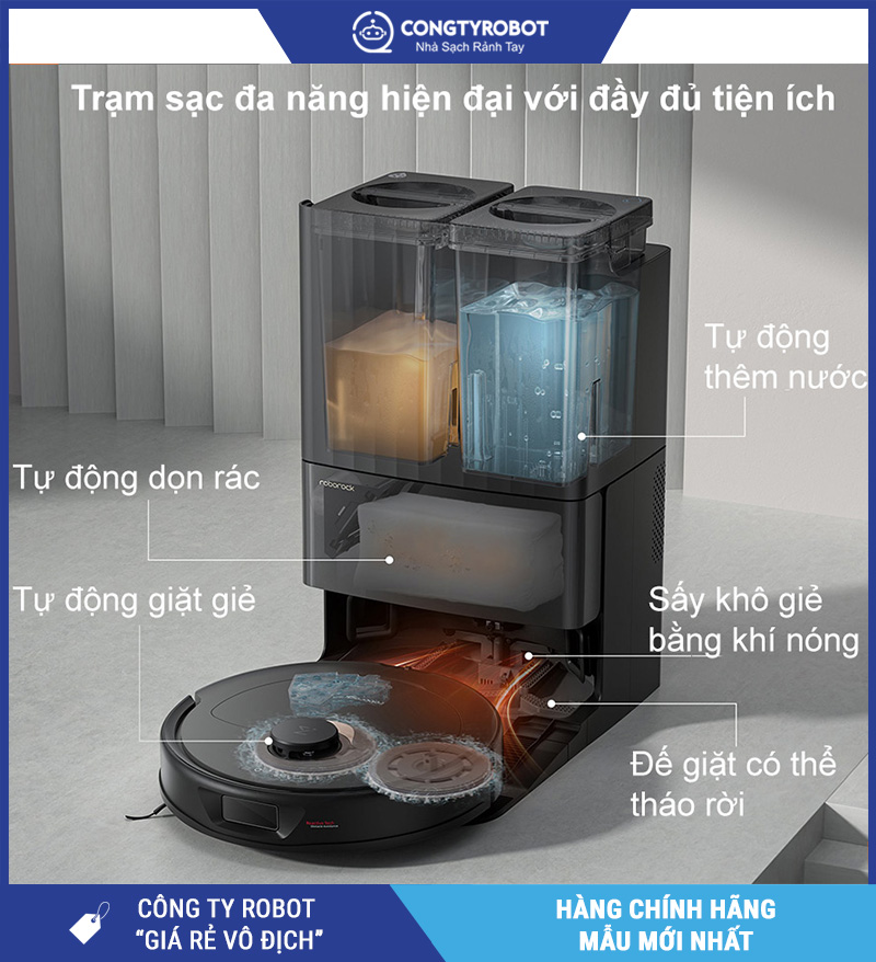 Dock sạc tích hợp các chức năng cao cấp: tự động đổ bụi, giặt giẻ bằng nước nóng 60°C, sấy khô bằng công nghệ FlashDry.
