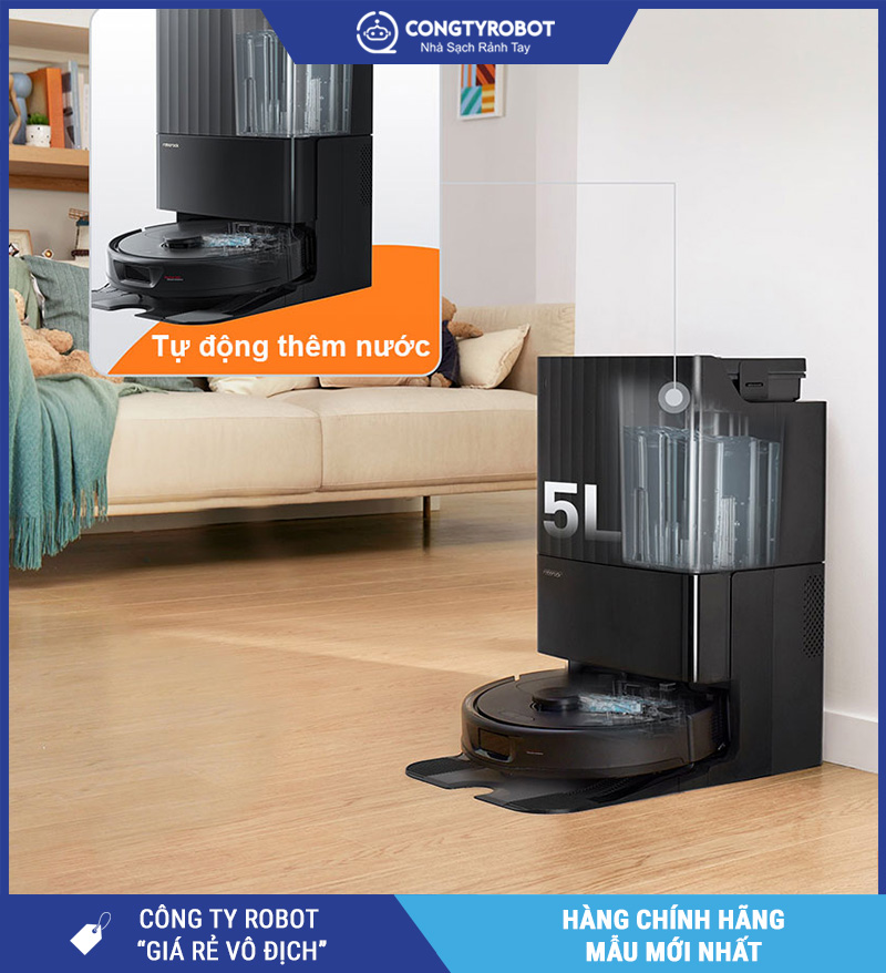 Tự động nạp lại bình nước, đảm bảo robot luôn có đủ nước để lau nhà mà không cần can thiệp thủ công.