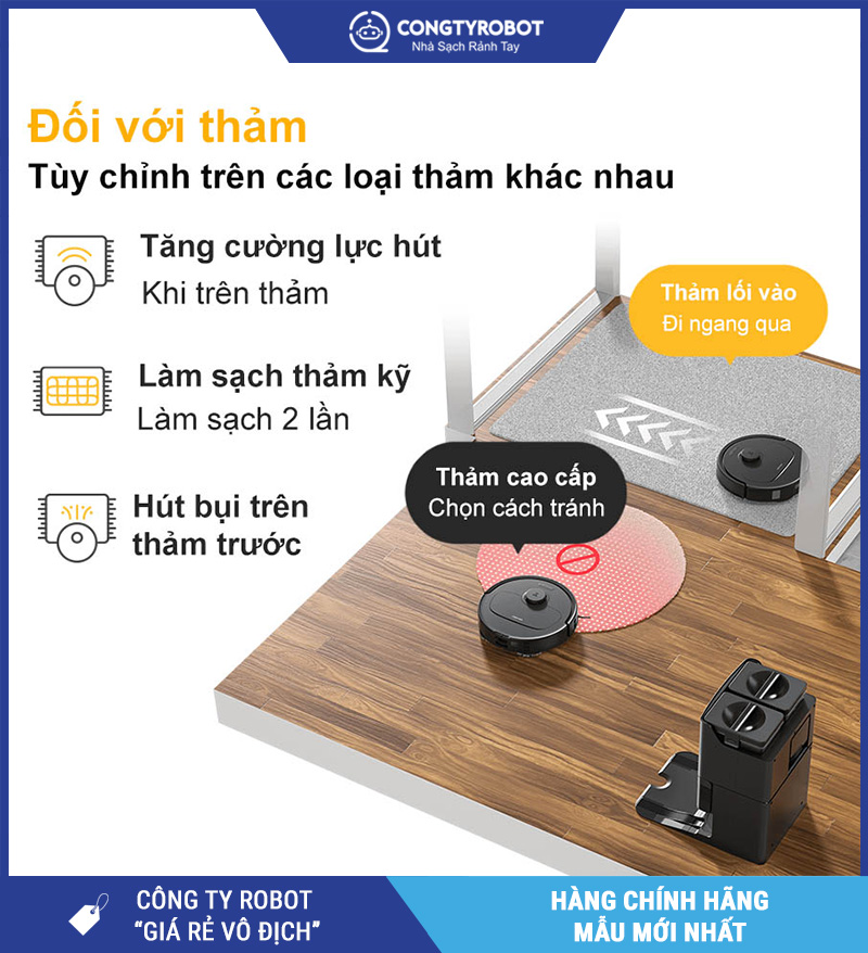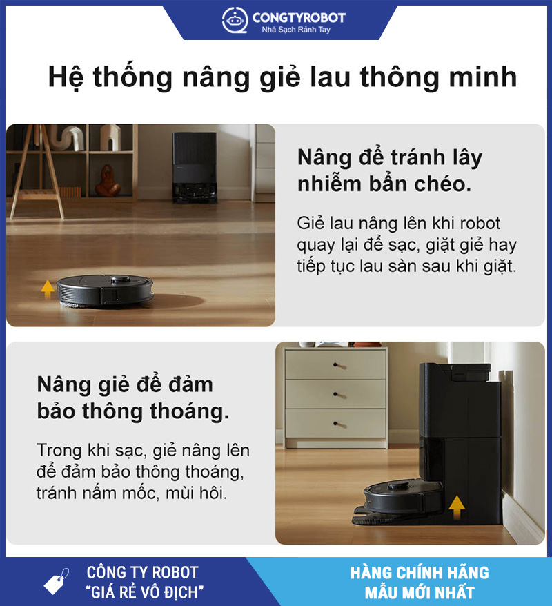 Tự động nâng giẻ lau khi quay về dock hoặc gặp thảm, hạn chế làm ướt thảm và tăng tuổi thọ robot.