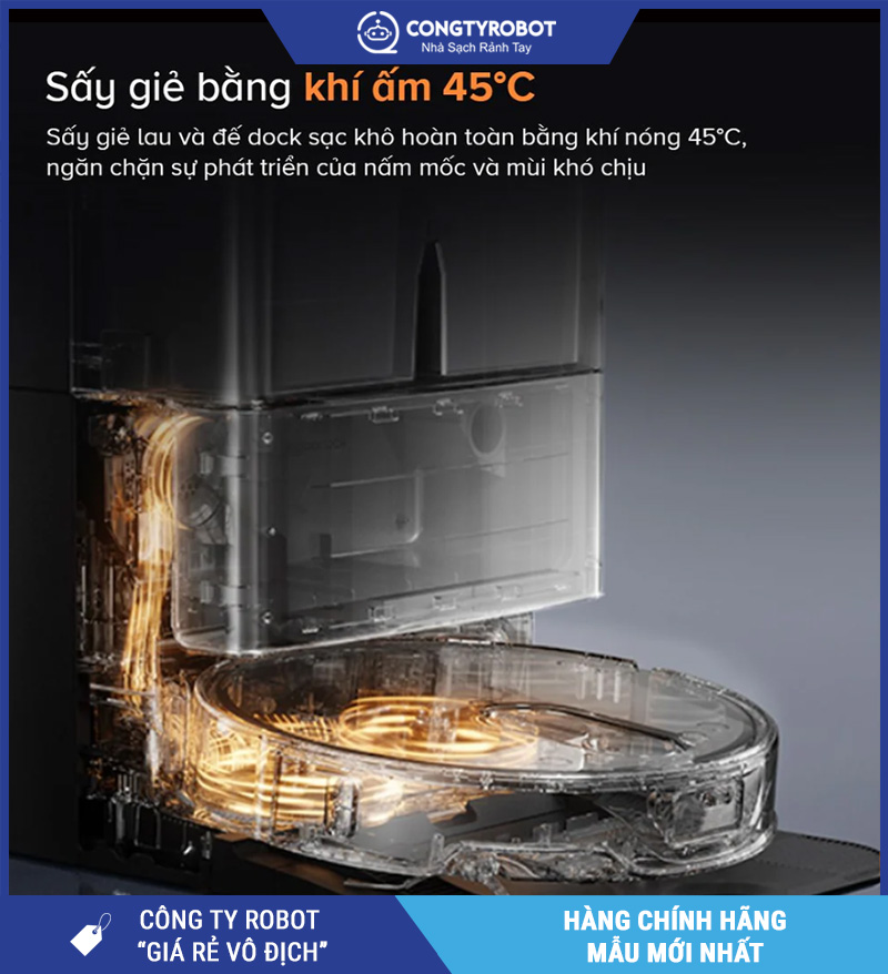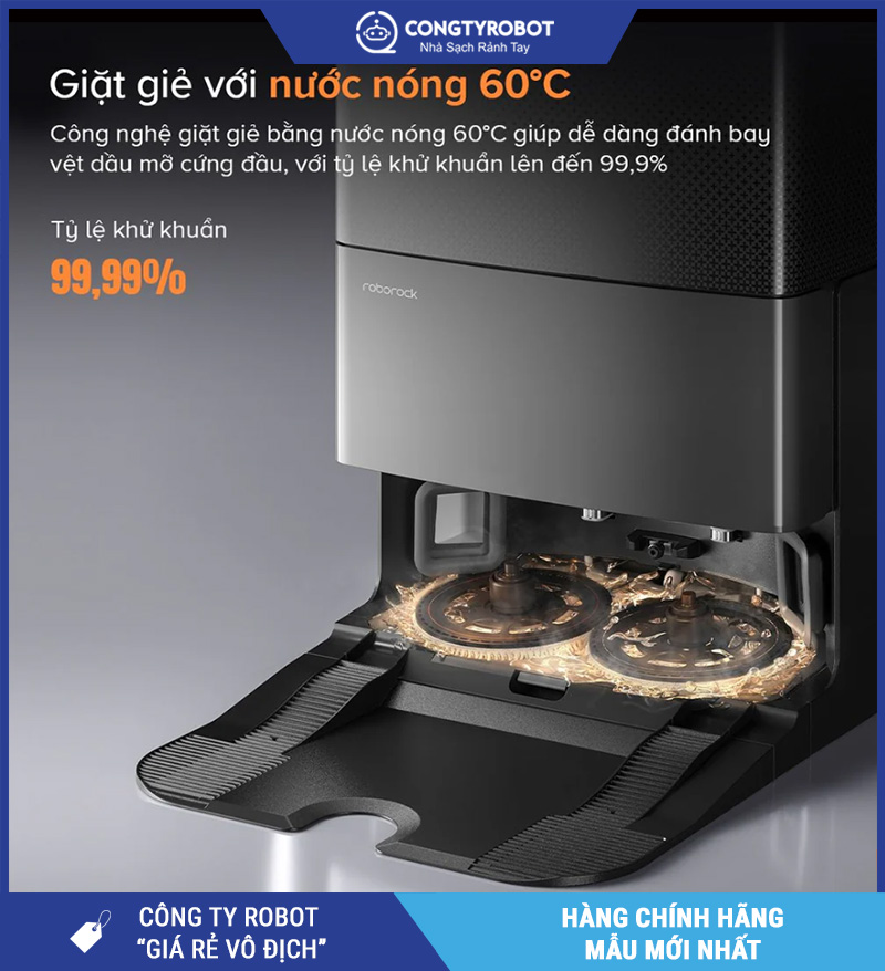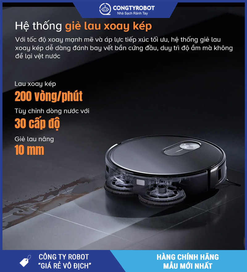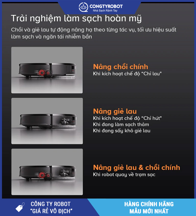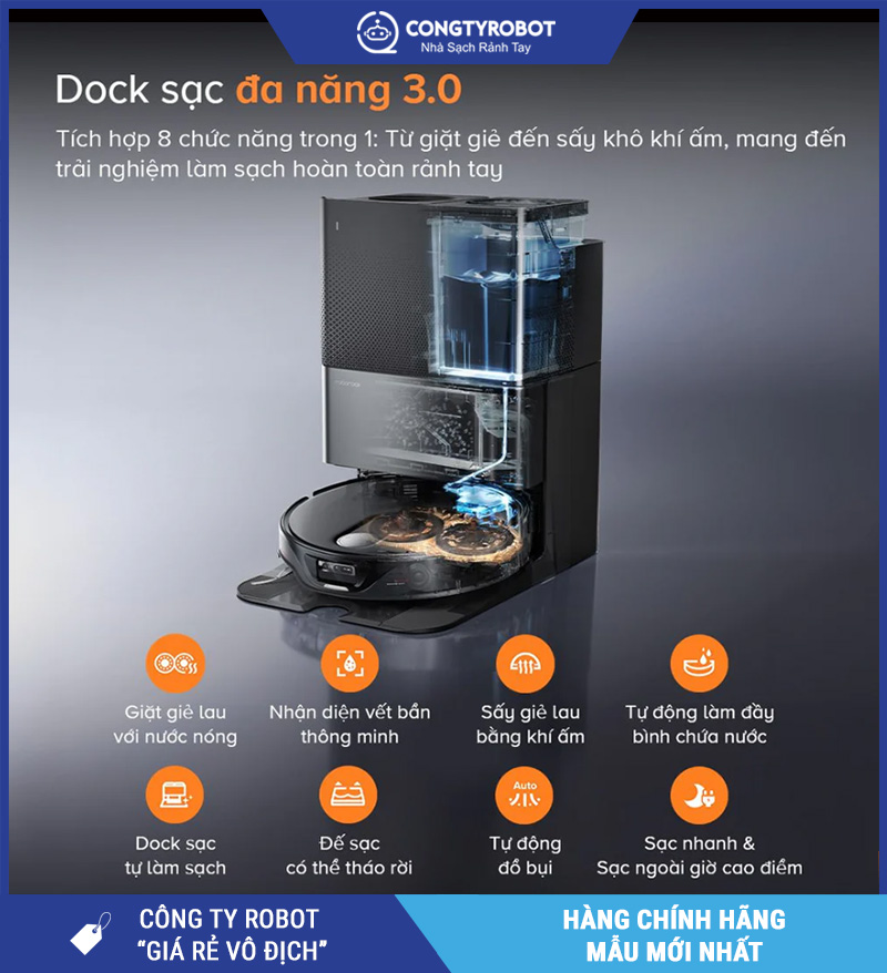 Bao gồm đầy đủ tính năng: giặt giẻ bằng nước nóng, sấy khô, tự đổ rác và bổ sung nước lau.