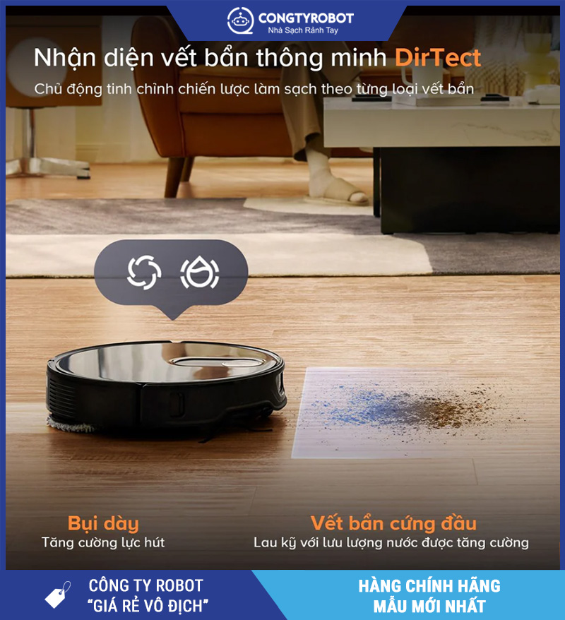 Cảm biến phát hiện mức độ bẩn và điều chỉnh lực hút/lau phù hợp từng vùng.