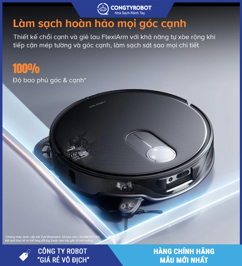 Công nghệ FlexiArm™ giúp robot mở rộng phạm vi làm sạch sang các mép tường, chân bàn ghế và góc hẹp – nơi thường bị bỏ sót.
