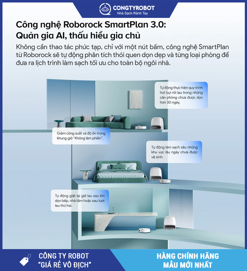 Tự động nhận diện phòng ốc, khu vực sàn, loại bề mặt (thảm, gạch, gỗ…).