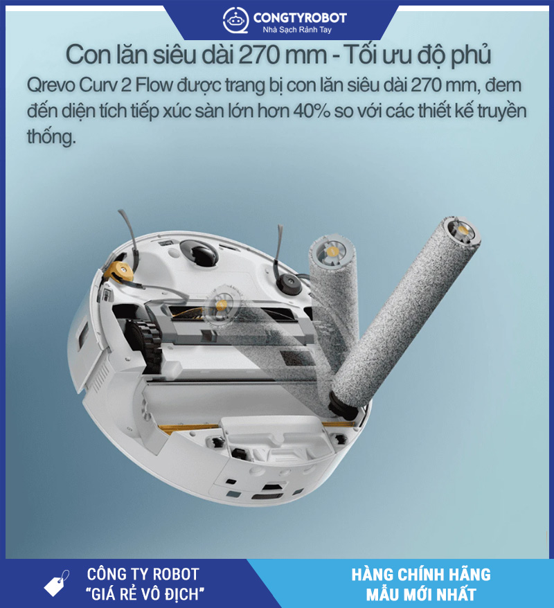 Khác với nhiều robot hút bụi lau nhà thông thường, Roborock Q Revo Curv2 Flow sở hữu con lăn lau siêu dài tới 270mm, giúp: