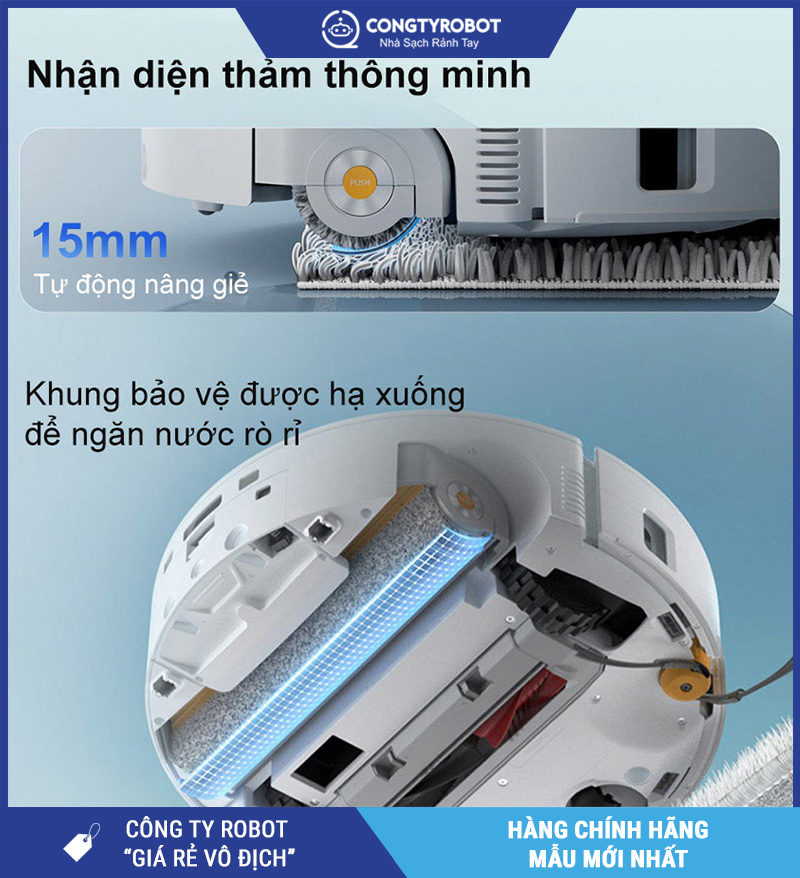 Khi robot nhận diện khu vực có thảm, hệ thống sẽ tự động nâng con lăn lau lên, chỉ hút bụi – tránh làm ướt thảm.