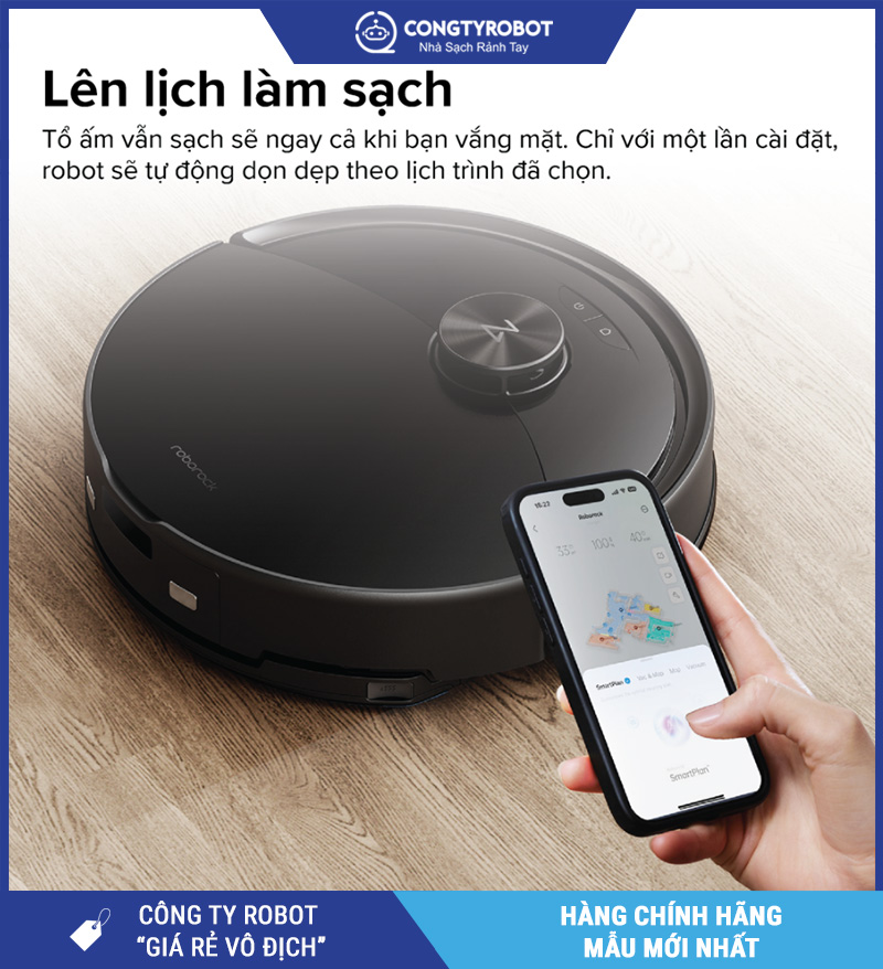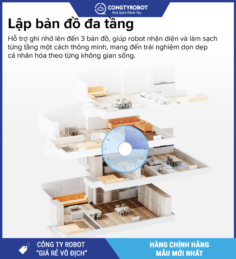 Robot có thể lưu trữ đến 4 bản đồ tầng khác nhau, tự động nhận diện không gian khi chuyển tầng. Người dùng dễ dàng thiết lập lịch làm sạch theo phòng, theo thời gian – tối ưu hóa hoạt động dọn dẹp.