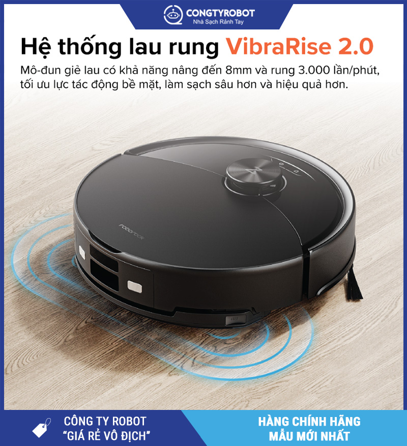 Công nghệ lau rung VibraRise 2.0 sử dụng cơ chế rung 3.000 lần/phút, mô phỏng chuyển động chà tay giúp làm sạch sâu các vết bẩn khô, dính như cà phê, trà, bùn đất... Đặc biệt hiệu quả ở những khu vực có nhiều người qua lại như bếp và hành lang.