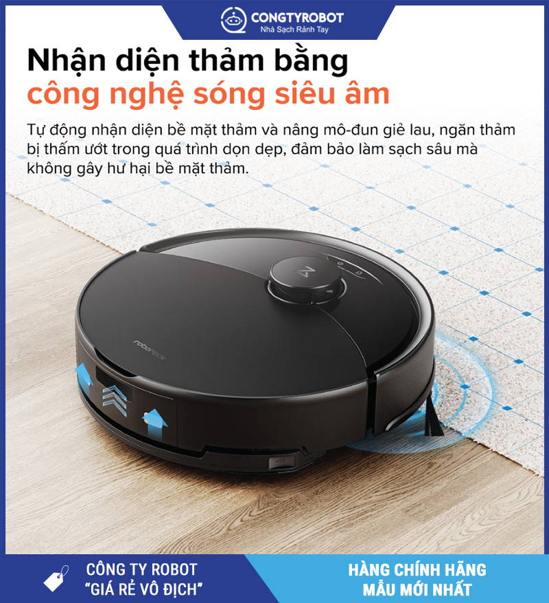 Cảm biến siêu âm giúp robot tự động nhận diện thảm và kích hoạt chế độ tăng lực hút hoặc nâng giẻ lau lên 8mm để tránh làm ướt thảm. Nhờ đó, robot vừa dọn sạch sâu, vừa bảo vệ tốt các loại sàn nhạy cảm.