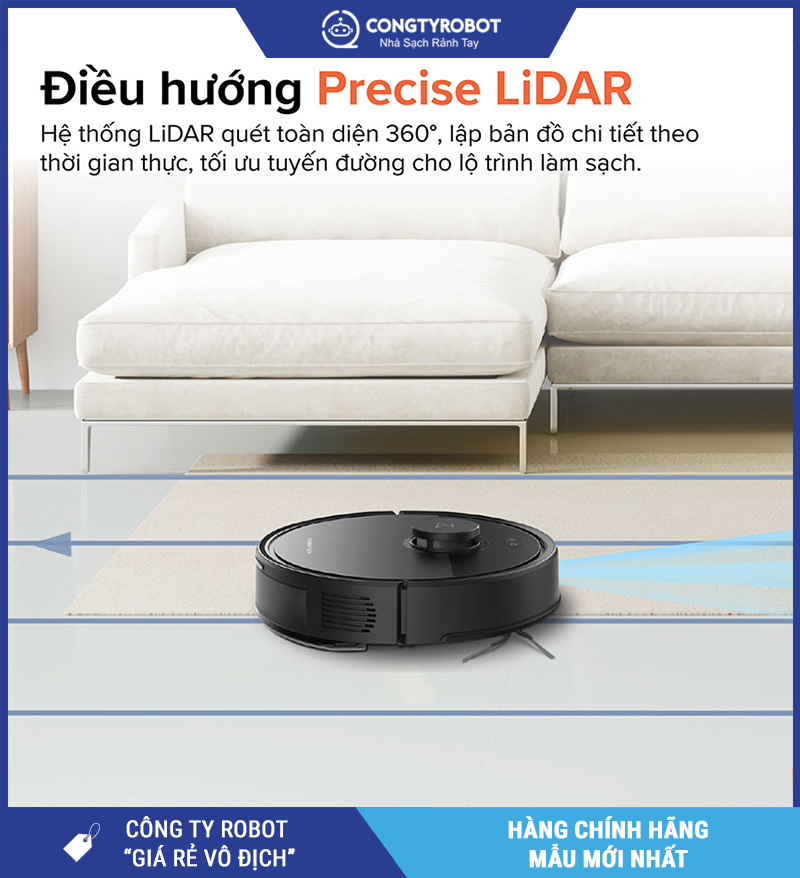 Với cảm biến Precise LiDAR quét 360 độ, robot nhận diện nhanh không gian và tạo bản đồ thông minh, tối ưu lộ trình di chuyển, tránh chướng ngại vật và không bỏ sót bất kỳ điểm nào.