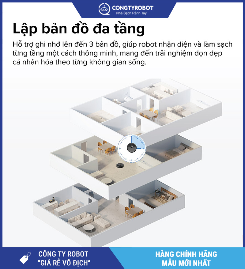 Robot có thể lưu trữ tới 3 bản đồ tầng khác nhau và tự động nhận diện khi được di chuyển giữa các tầng. Bạn dễ dàng thiết lập vùng cấm, vùng ưu tiên và đặt lịch làm sạch theo từng khu vực trong nhà.