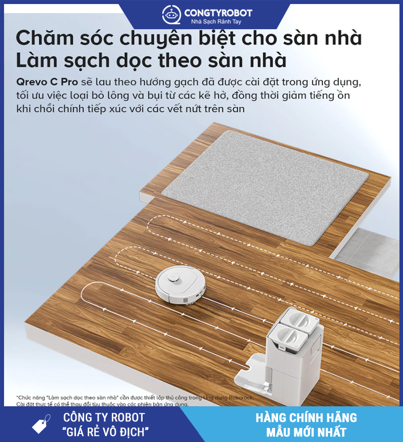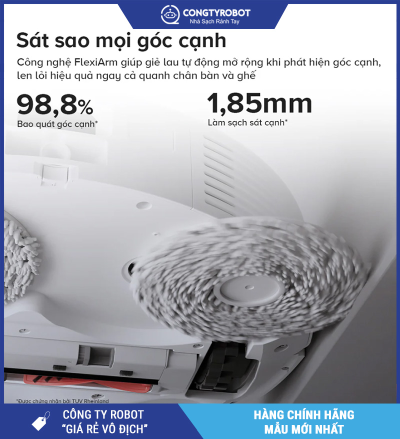 Một điểm robot hay “bỏ sót” là sát mép tường, chân tủ, chân sofa—nơi bụi và tóc thường dồn lại. Roborock Qrevo C Pro trang bị cây lau FlexiArm có khả năng vươn ra khi gặp cạnh/góc, giúp tăng vùng tiếp xúc để lau sát mép tốt hơn.