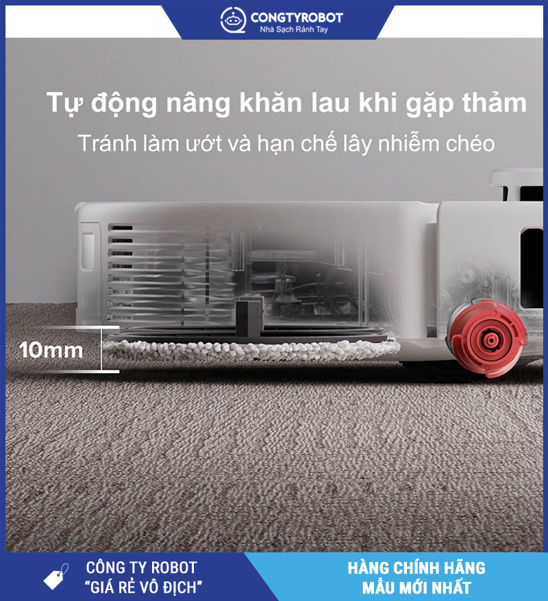 Khi gặp thảm, robot có thể tự nâng giẻ lau, giảm nguy cơ làm ướt thảm và hạn chế mùi ẩm.
