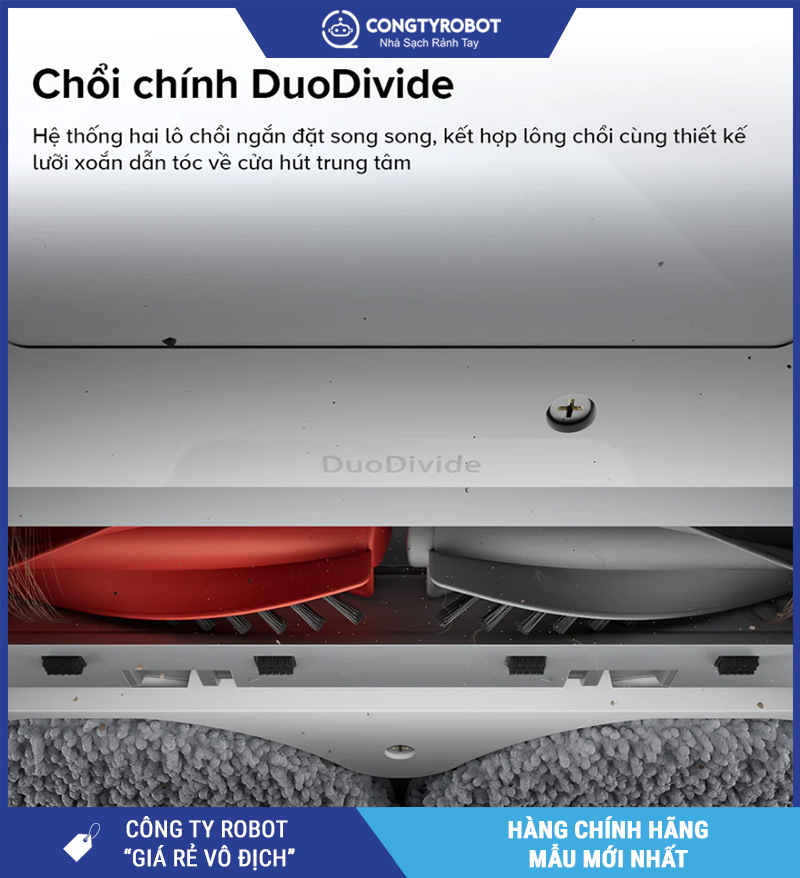 Tóc rối/lông thú là “kẻ thù truyền kiếp” của robot hút bụi. DuoDivide là thiết kế chổi chính kép hướng đến việc dẫn tóc vào cửa hút thay vì quấn quanh trục chổi.