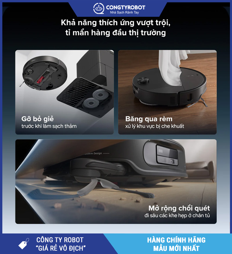 Bên cạnh đó, robot hỗ trợ tự động nâng giẻ 20 mm, giúp thích ứng tốt hơn khi di chuyển qua các khu vực khác nhau trong nhà. Trên trang sản phẩm, hãng cũng nhắc đến khả năng gỡ bỏ giẻ trước khi làm sạch thảm, cho thấy thiết bị được thiết kế để xử lý linh hoạt hơn giữa sàn cứng và bề mặt thảm.