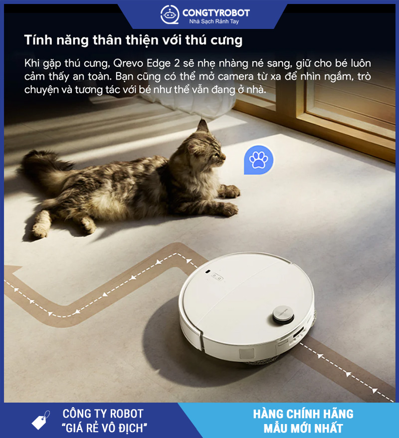 Roborock giới thiệu Qrevo Edge 2 là mẫu robot thân thiện với thú cưng, có khả năng nhận diện, né tránh vật nuôi và hỗ trợ quan sát, tương tác từ xa qua camera. Đây là tính năng rất phù hợp với các gia đình nuôi chó mèo, vừa hỗ trợ dọn sạch lông và bụi bẩn hằng ngày, vừa giúp robot di chuyển an toàn hơn trong nhà.