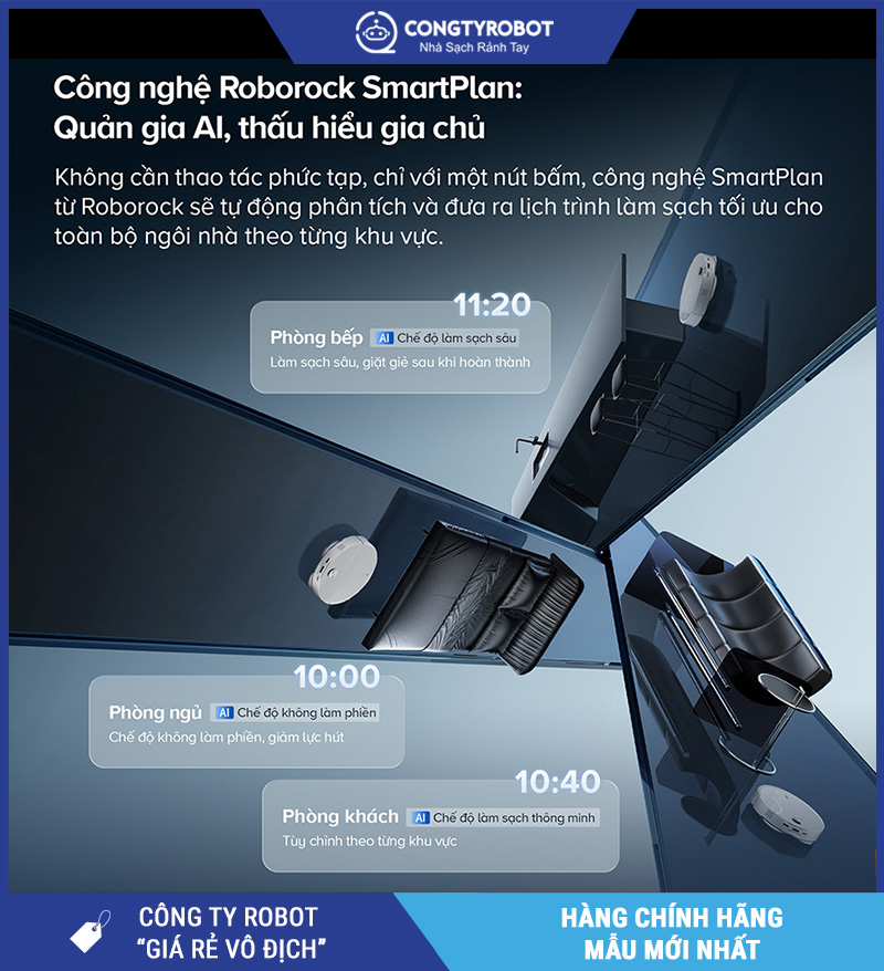 Một điểm đáng chú ý khác là công nghệ Roborock SmartPlan AI. Hãng mô tả đây là tính năng giúp robot tự động phân tích không gian và đưa ra lịch trình làm sạch tối ưu cho toàn bộ ngôi nhà theo từng khu vực, chỉ với một nút bấm. Ví dụ được hãng minh họa gồm phòng ngủ ở chế độ giảm lực hút, phòng khách làm sạch thông minh và phòng bếp làm sạch sâu kèm giặt giẻ sau khi hoàn thành.