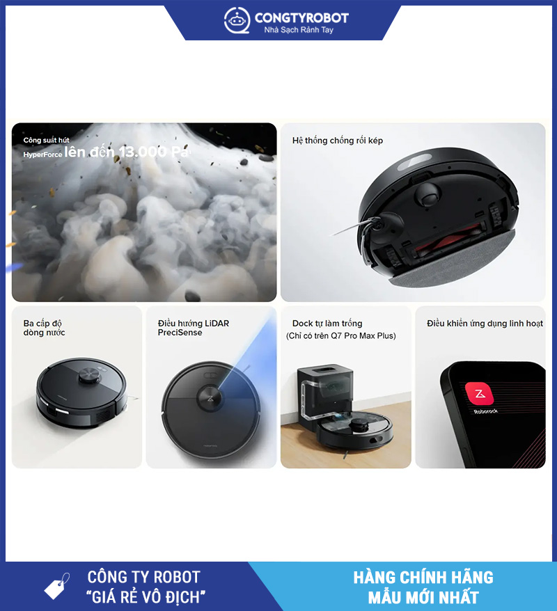Roborock Q7 Pro Max+ là mẫu robot hút bụi lau nhà thông minh được định hướng cho nhu cầu làm sạch toàn diện trong gia đình hiện đại. Sản phẩm nổi bật với lực hút HyperForce 13.000Pa, hệ thống lau 3 mức nước, công nghệ điều hướng LiDAR PreciSense quét 360°, bộ chổi kép chống rối, cùng trạm sạc RockDock Plus có khả năng tự động gom bụi trong nhiều tuần. Đây là dòng robot phù hợp với người dùng muốn giảm bớt đáng kể thời gian dọn nhà nhưng vẫn duy trì được hiệu quả làm sạch ổn định mỗi ngày.
