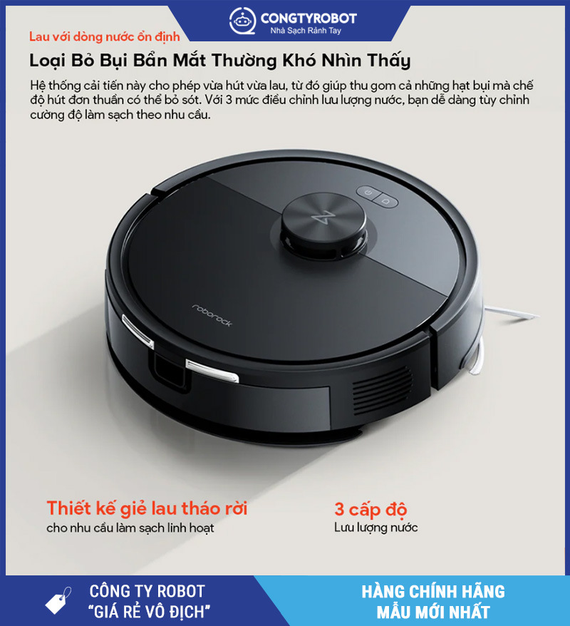 Hệ thống lau của máy có 3 mức nước để người dùng tùy chỉnh theo từng khu vực và mức độ bẩn thực tế. Bơm nước được mô tả là duy trì lưu lượng ổn định, giúp sàn được lau đều hơn mà không gây đọng nước quá nhiều, từ đó phù hợp hơn với nhiều bề mặt như sàn gỗ, sàn đá hay gạch men. Giẻ lau tháo rời cũng giúp việc vệ sinh và thay thế phụ kiện thuận tiện hơn trong quá trình sử dụng lâu dài.