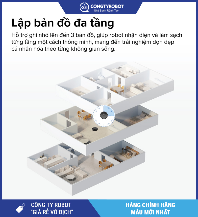 Robot có thể lưu trữ đến 3 bản đồ tầng khác nhau. Khi bạn chuyển robot lên tầng mới, thiết bị tự động nhận diện và áp dụng bản đồ phù hợp. Người dùng có thể: