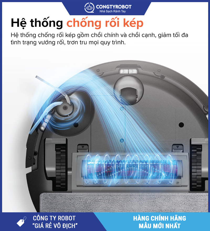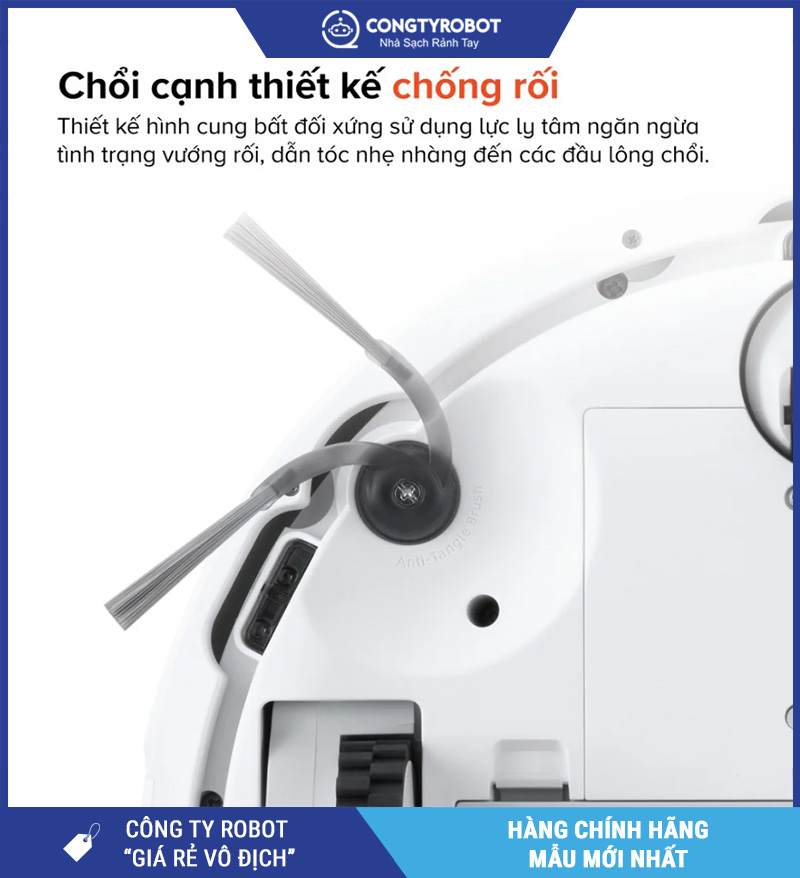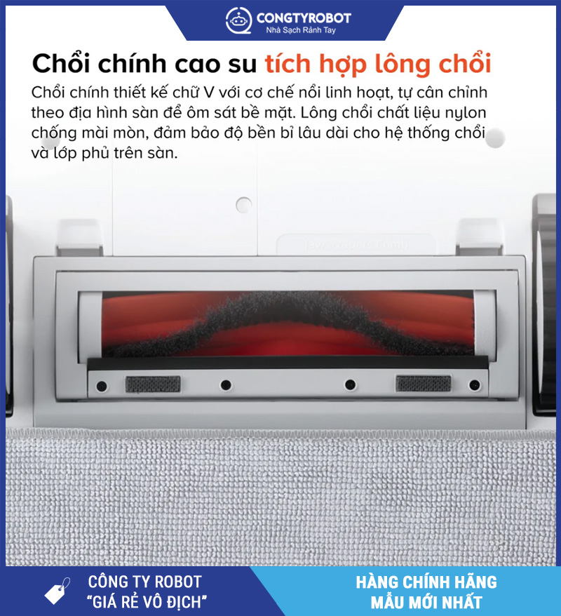 Chổi chính bằng cao su mềm kết hợp cùng chổi cạnh linh hoạt giúp loại bỏ tóc, lông động vật mà không bị rối. Thiết kế tối ưu này không chỉ giữ hiệu suất làm sạch ổn định mà còn giúp dễ dàng tháo rời vệ sinh, tiết kiệm thời gian bảo trì.